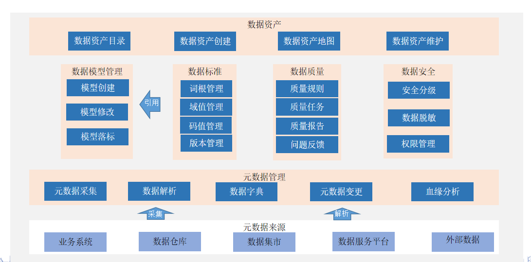 數(shù)據(jù)資產(chǎn)管理平臺包括數(shù)據(jù)標(biāo)準(zhǔn)管理、元數(shù)據(jù)管理、數(shù)據(jù)質(zhì)量、數(shù)據(jù)資產(chǎn)管理、數(shù)據(jù)安全管理共5大模塊。