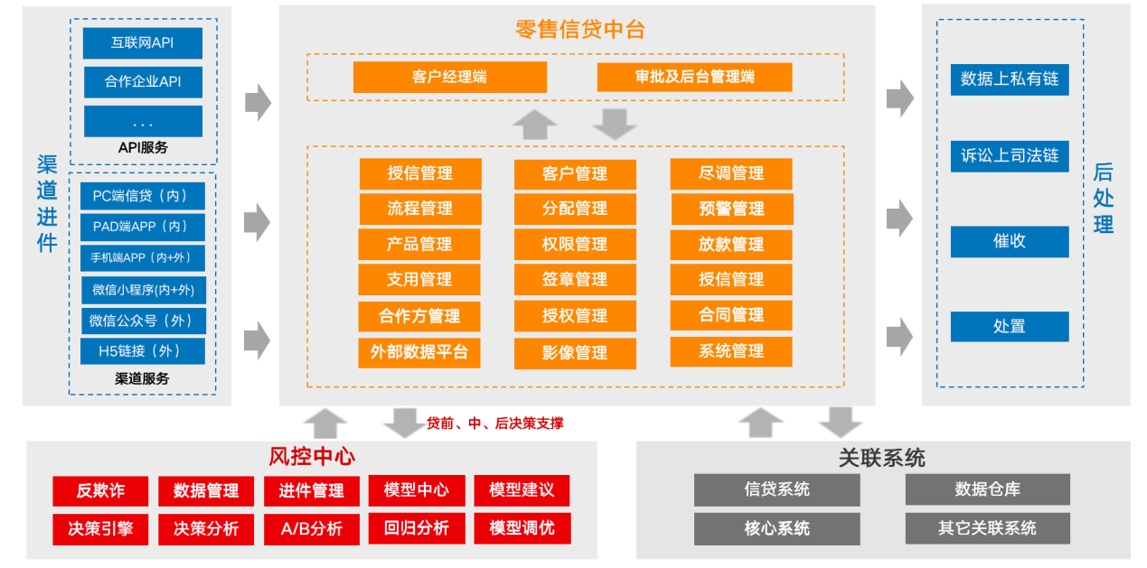 平臺與行內系統對接,以全新的技術平臺為底座,搭建客戶平臺、行內人員平臺、后臺管理平臺、風控系統四套子系統,支持在線上平臺完成貸款從申請、受理、授信、審批、用款、還款、貸后的完整流程,具備線上貸款業務閉環管理的特點。