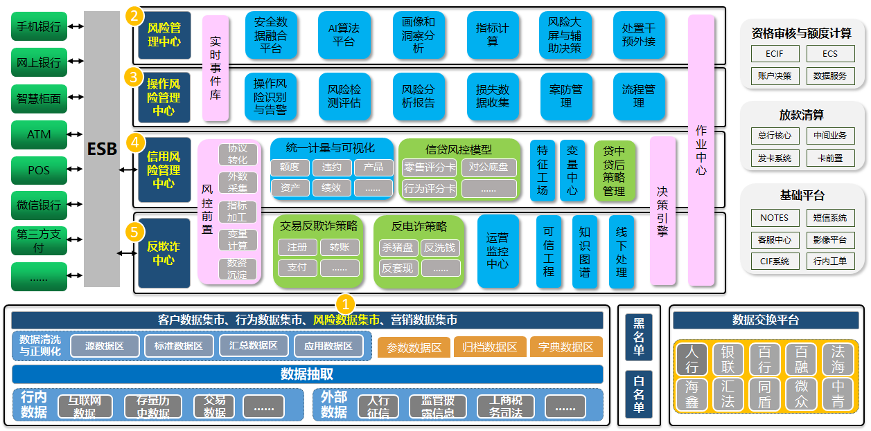 為銀行建設(shè)全行級風控中臺系統(tǒng),包括五個核心部分:風險數(shù)據(jù)集市、風險管理中心、操作風險管理中心、信用風險管理中心和反欺詐中心。