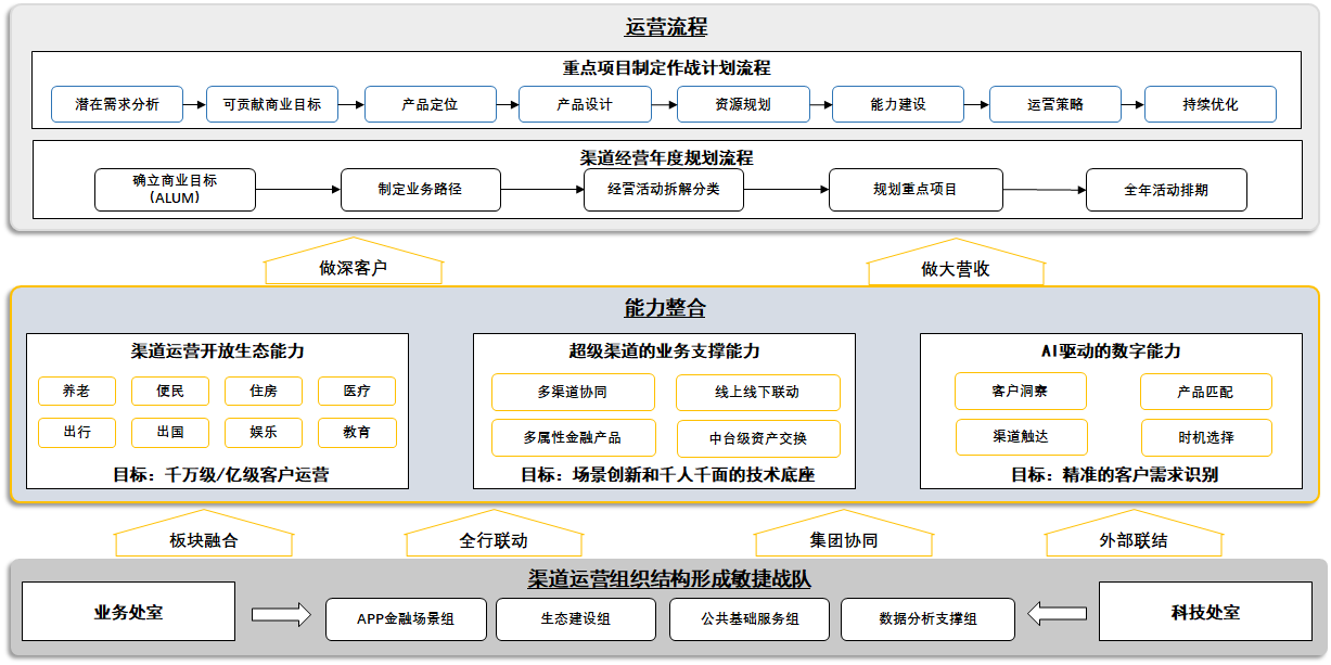 一、復刻某頭部股份制銀行模式:為行方完整規劃組織、產品、生態、渠道、平臺的建設思路。執行渠道運營頂層設計并落地,包含BIP和BOP。